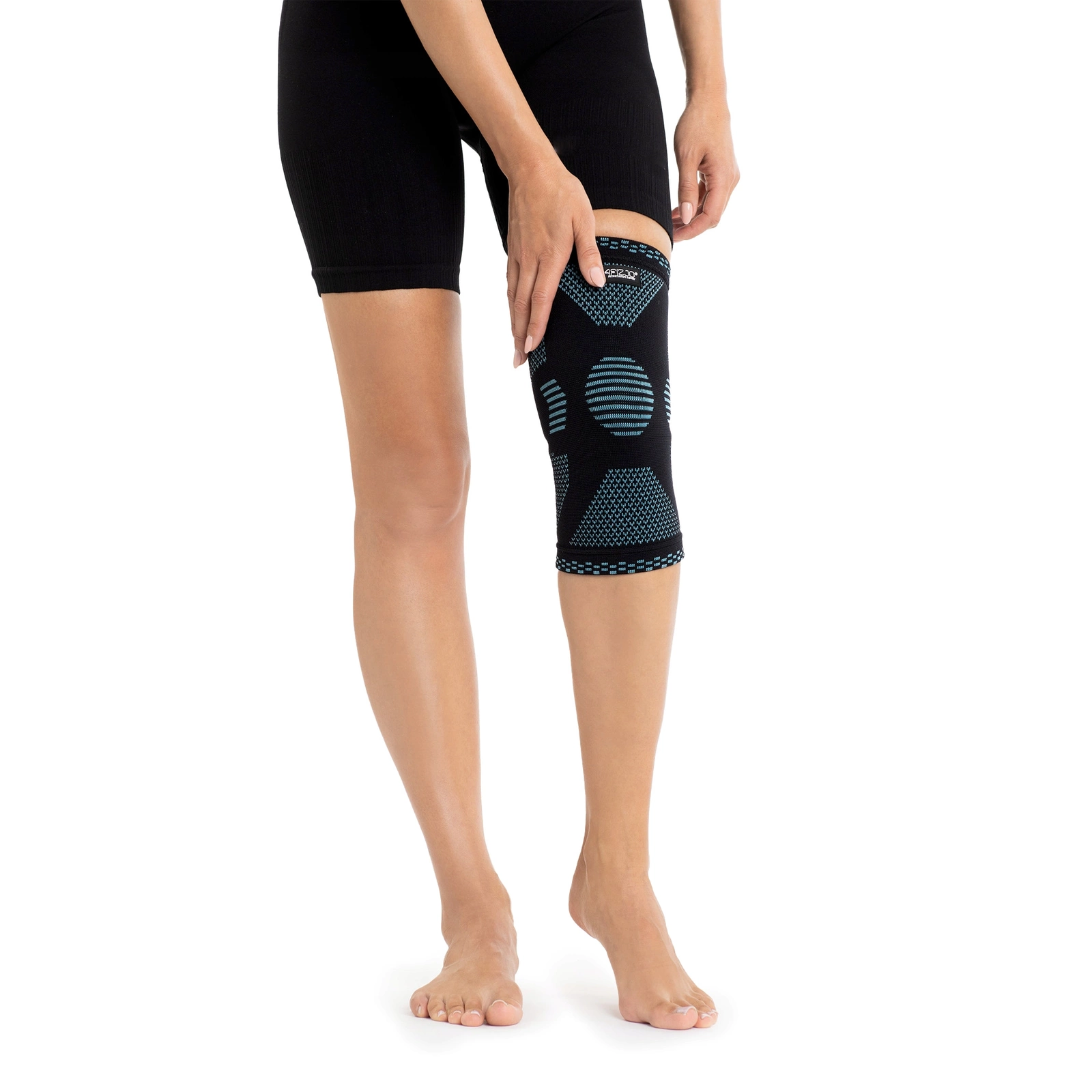 Forma anatomică a ortezei sportive pentru genunchi se potrivește perfect cu corpul. Materialul special profilat cu spațiu pentru rotulăminimizează riscul de luxație și de rotație necontrolată a articulației. Genunchiera se potrivește perfect pe piele la nivelul articulaților articulare, astfel încât acestea să poată funcționa în toată gama lor de mișcare. Materialul moale de la nivelul curburii genunchiului nu pune presiune pe zonele sensibile. Cercul de strângere al ortezei este acoperit cu silicon, ceea ce împiedică alunecarea în jos sine stătătoare. Stabilizatorul rămâne la locul său pe picior, adaptându-se la mișcarea genunchiului și nu îi limitează amplitudinea de flexie.