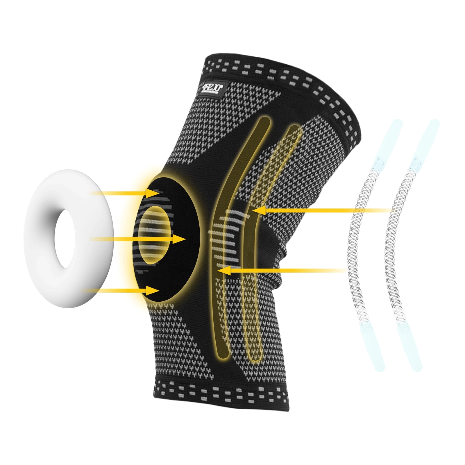 Genunchiera are un inel de gel încorporat. Acesta joacă un rol important în stabilizarea rotulei, minimizând riscul de deteriorare a acesteia. Inelul elastic pentru rotulă se adaptează la convexitatea genunchilor. Acest lucru face ca purtarea acestui ajutor ortopedic să fie confortabilă și convenabilă. Atelele elastice protejează genunchiul de efectele rotațiilor bruște ale articulației. Atelele de formă anatomică permit genunchiului să se flexeze liber, fără a pune presiune pe ligamentele colaterale. Ca o consecință a acestui fapt, orteza articulației genunchiului elimină senzația de disconfort. Finisajul din silicon de pe interiorul stabilizatorului împiedică în mod eficient ca acesta să alunece singur în jos.