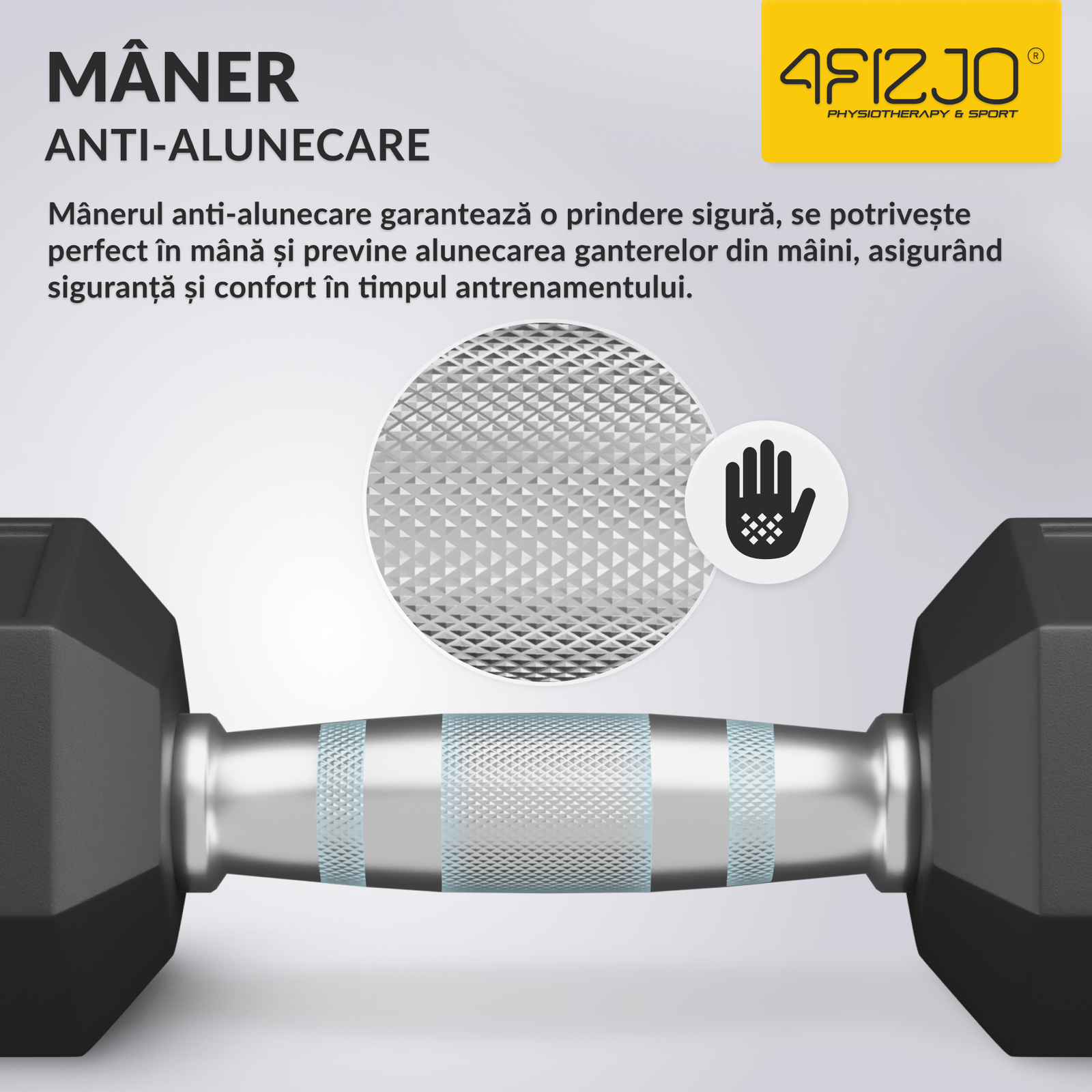 ▶️ Un mâner antiderapant garantează o prindere sigură, se potrivește perfect în mână și împiedică alunecarea halterelor din mâini, asigurând siguranță și confort în timpul antrenamentului.